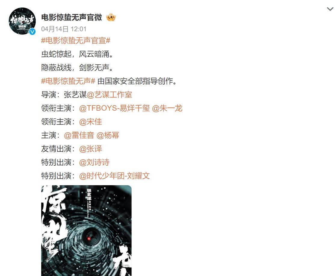 在这之后,杨幂以碎裂身份出演了陈可辛导演的新片《酱园弄》,而如今又以碎裂的身份出演了张艺谋的新片《惊蛰无声》。
