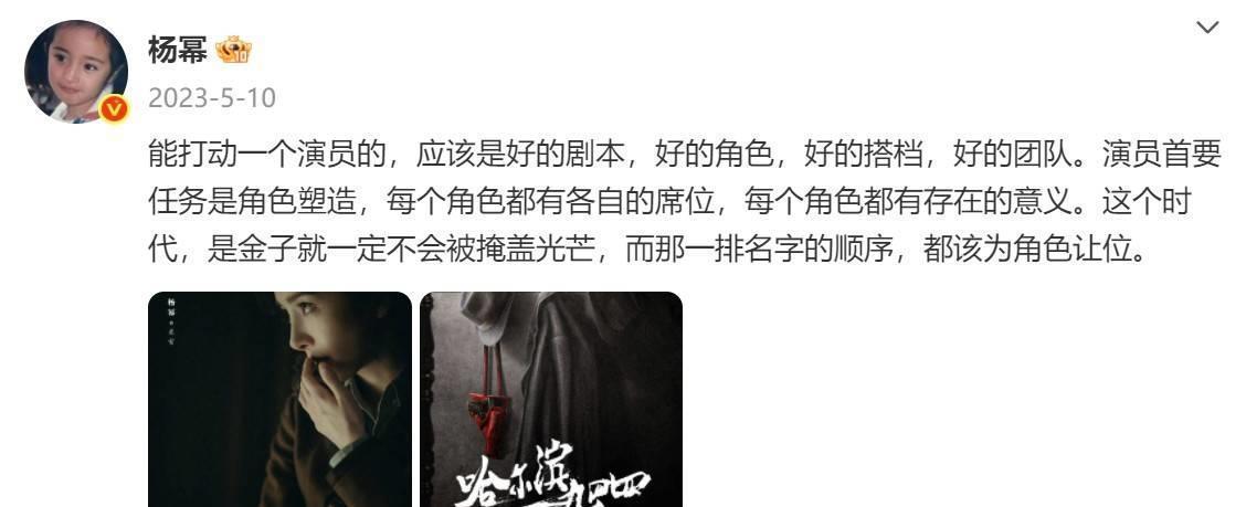 此前,在恢复《哈尔滨一九四四》番位争议时,杨幂发了这么一段话。