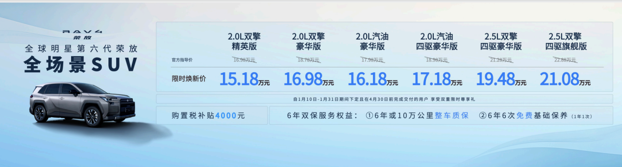 万能担当全新荣放,行为本次请托的主角,其官方价钱区间为16.98万元-22.88万元,限时焕新价15.18万元-21.08万元。1月10号-1月31日历间下定且在4月30日前完成请托的用户,即可享受4000 元购置税补贴+ 6年双保办事权柄,实惠满满,丹心皆备。