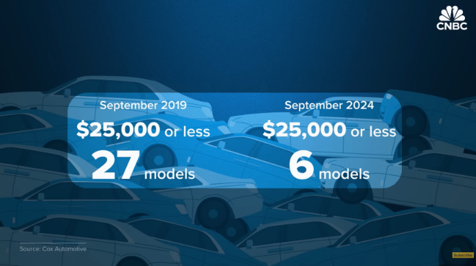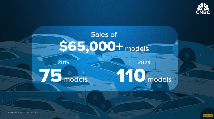笔据好意思国CNBC的数据,19年好意思国阛阓上起售价低于2.5万好意思元的车型还有27个,到了24年就只须6款;售价跳动6.5万好意思元的车型,也从19年的75个飙升到110个。