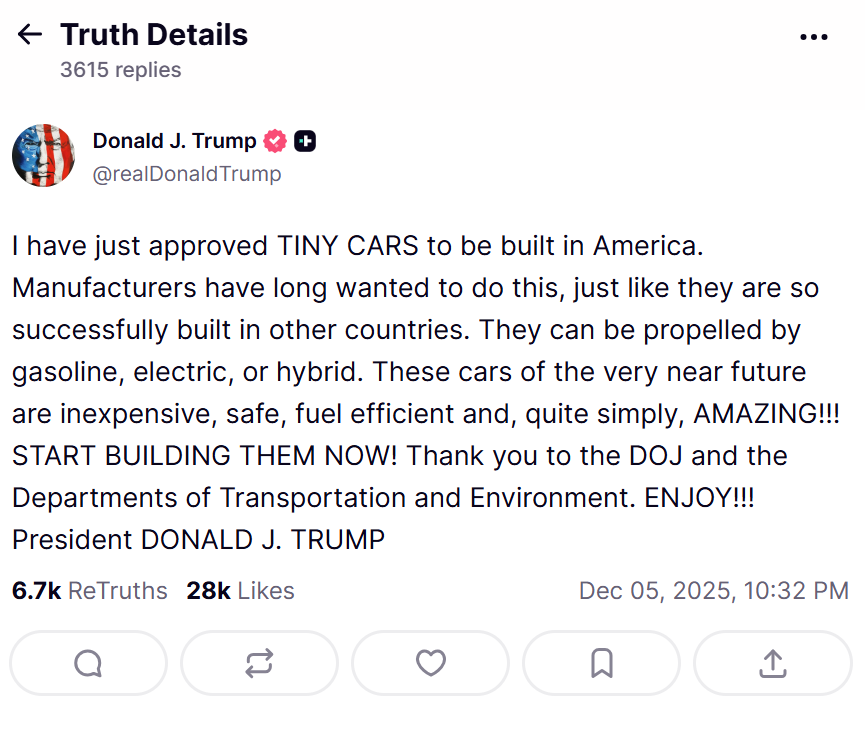 并吞下前段时辰,特朗普在社媒上文告,认真批准在好意思国分娩小型汽车,还说这种车价钱实惠、安全、省油。