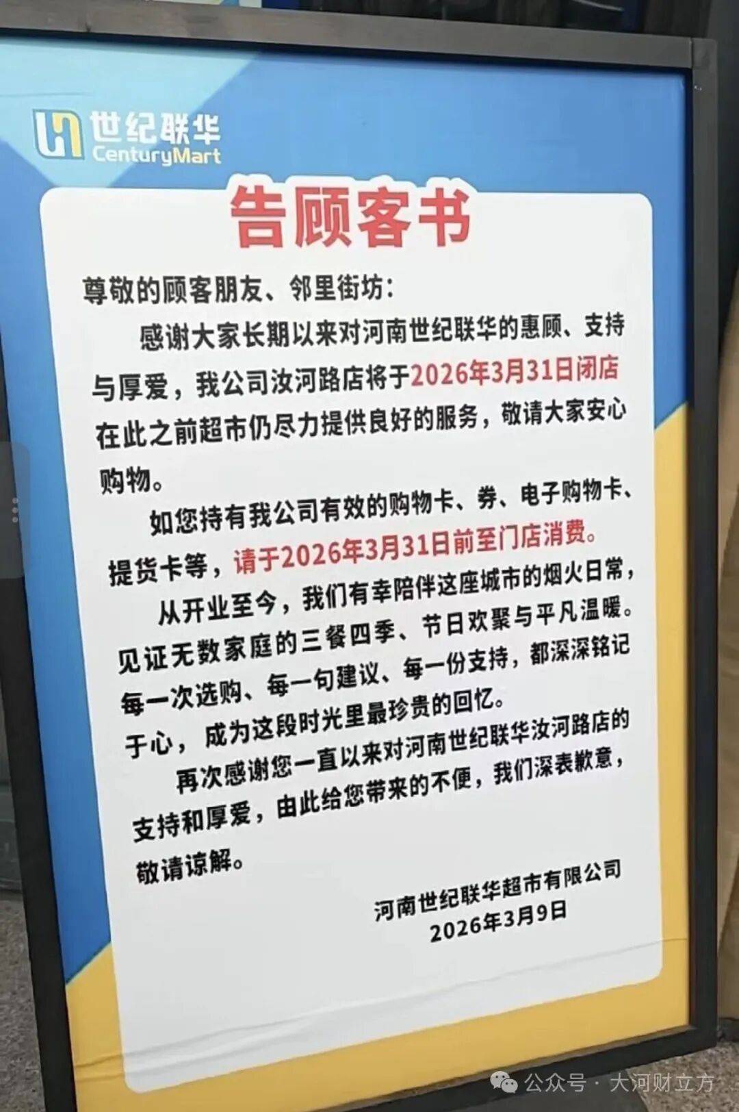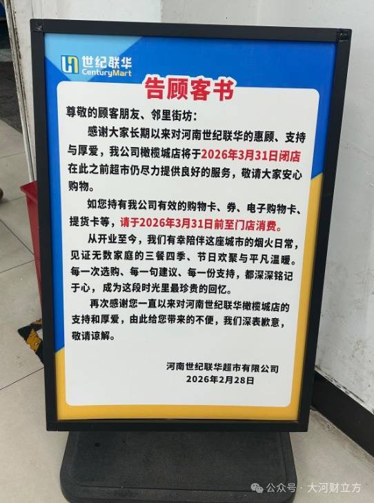 3月1日,大河财立方记者分辨实地走访上述两店。辞世纪联华郑州橄榄城店,进口处张贴的关闭公告提到,河南世纪联华超市有限公司橄榄城店将于2026年3月31日闭店。捏有该公司购物卡、券、电子购物卡、提货卡的消耗者,可于2026年3月31日前至门店消耗。