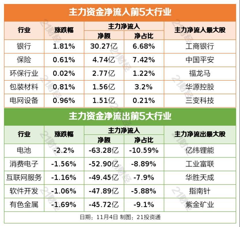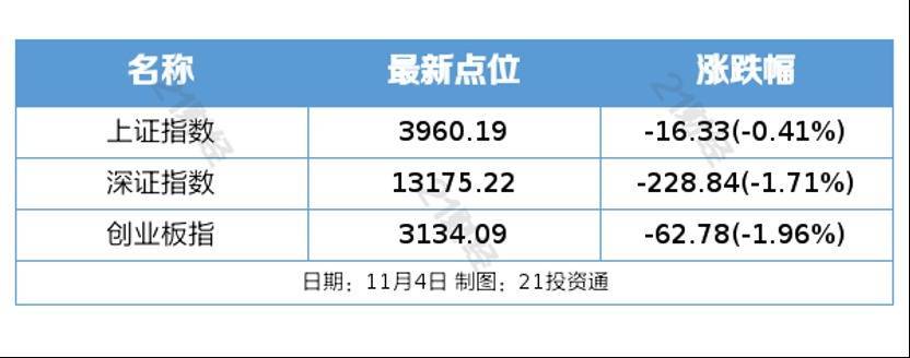 11月4日,商场全天缩量转化,创业板指跌近2%。律例收盘,沪指跌0.41%,深成指跌1.71%,创业板指跌1.96%。量能陆续萎缩,沪深两市成交额不及2万亿元,较上一个往来日缩量1914亿元。
