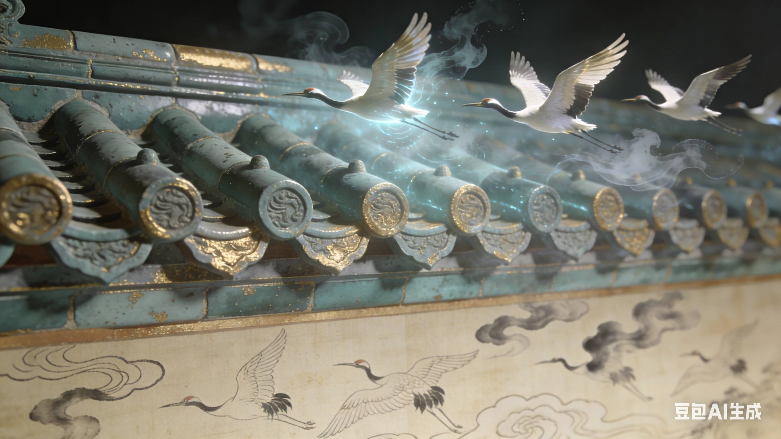 底层保留原作壮健线稿,勾画丹顶鹤的灵动姿态与宫殿空洞,尽显宋代工笔的斯文风骨;中层访佛故宫琉璃瓦 3D 建模纹理,青蓝釉色随光影流转,让古建肌理与画作田地深度和会;顶层借 AR 本事赋予鹤群人命,仙鹤振翅盘旋、掠过檐角,冲破二维枷锁。