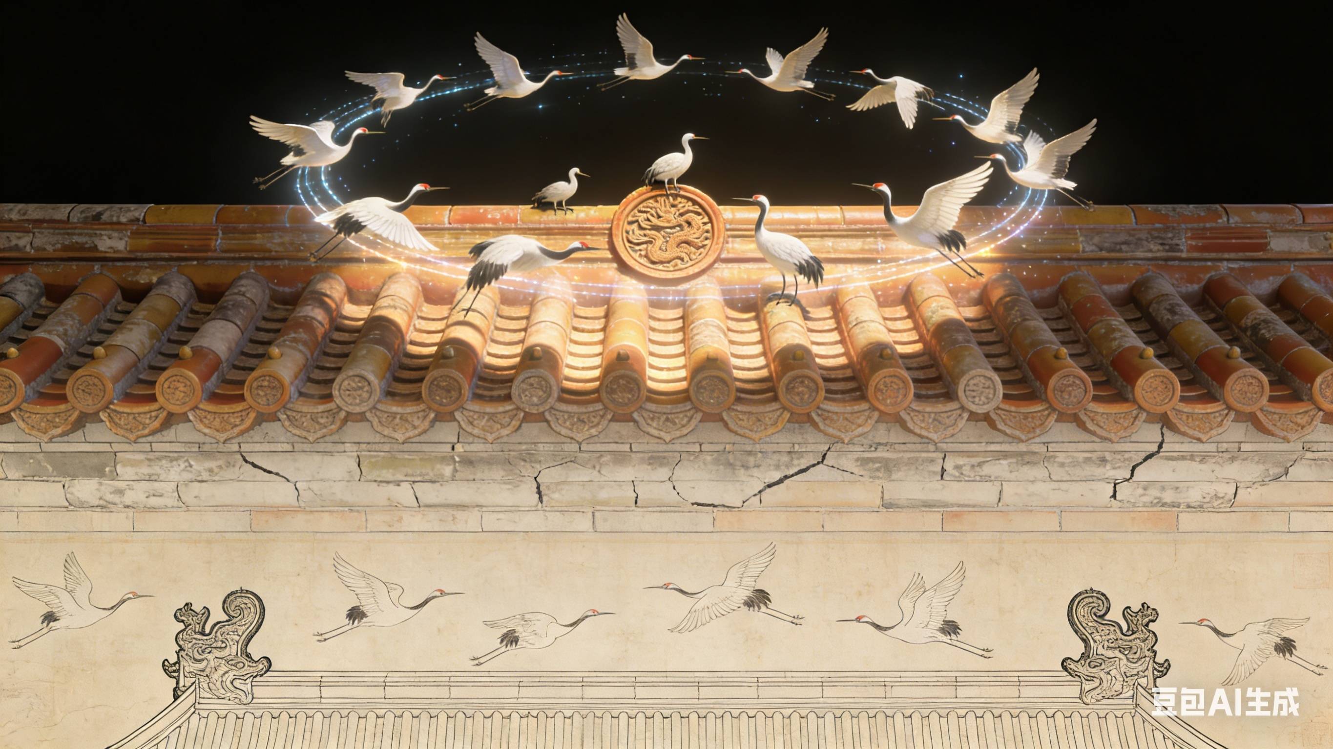 宋徽宗《瑞鹤图》以 AI 本事完成跨时空解构与重塑,构建出三层递进的数字艺术世界。