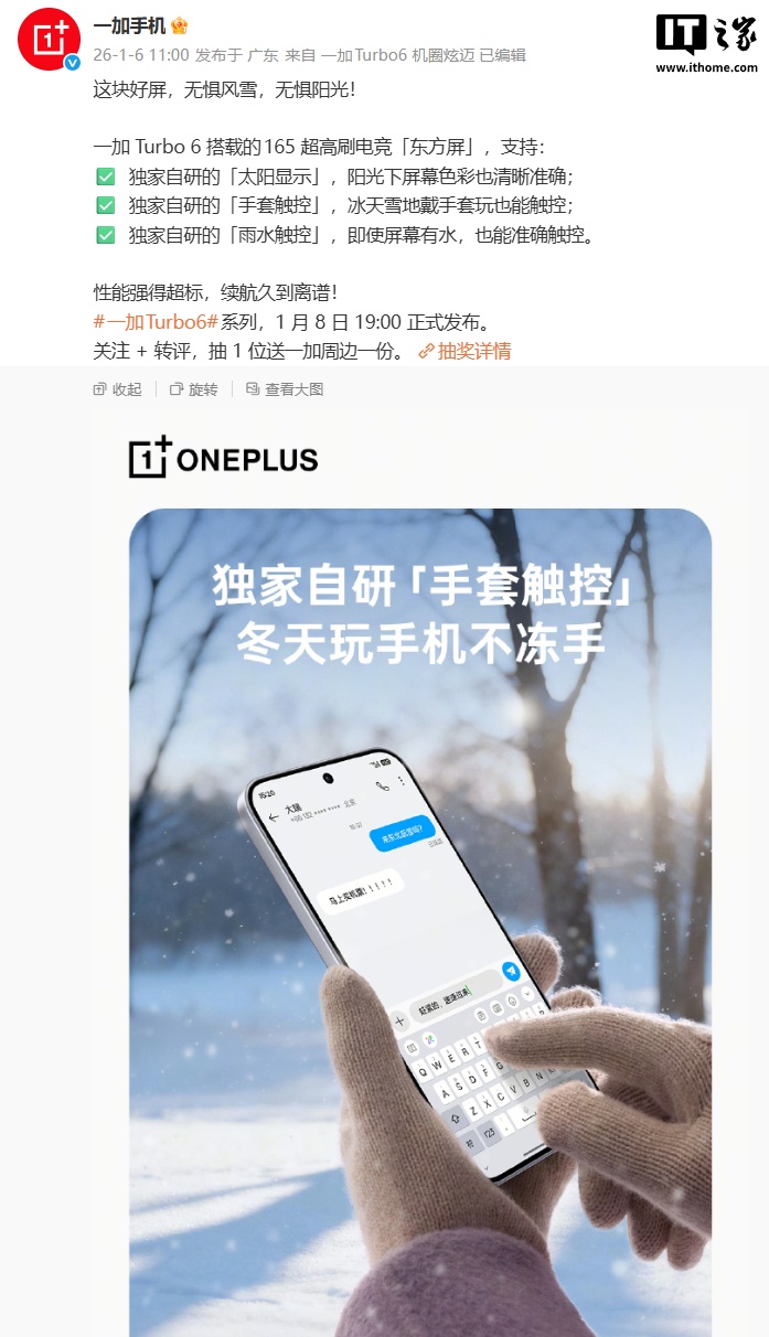 另外,一加 Turbo 6 的这块超高刷电竞「东方屏」还维持独家自研的「太阳表示」、「手套触控」、「雨水触控」,可在阳光下正确明晰表示色调履行,并维持戴手套触控、屏幕有水时触控等。